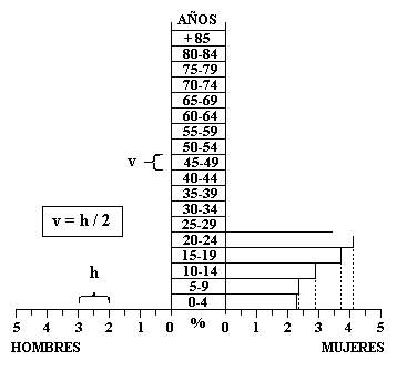 Gráfico 10. Pirámide de población (España 1996). En el gráfico se representan mediante barras, las proporciones de hombres (izquierda) y mujeres (derecha) divididos en tramos de cinco años.
