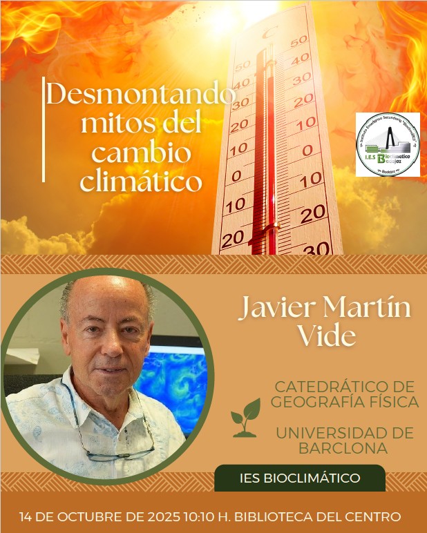 El próximo martes 14 de octubre, el catedrático emérito de la Universidad de Barcelona, el Dr. Javier Martín Vide, visitará el IES Bioclimático de Badajoz para charlar con el alumnado de Bachillerato de Geografía y Física sobre Cambio Climático. Es una oportunidad única para oír en la voz de uno de los mayores expertos españoles en Climatología aquellas cuestiones claves para entender en qué consiste el cambio climático y desmitificar determinadas creencias populares de escasa base científica sobre el mismo.