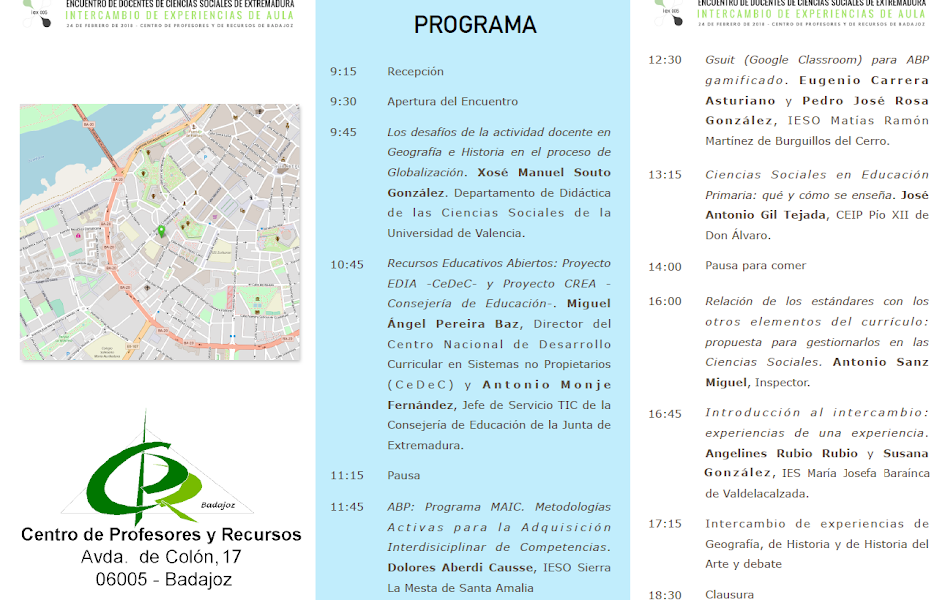 El próximo sábado 24 de febrero tendrá lugar el Encuentro de Docentes de Ciencias Sociales de Extremadura en el CPR de Badajoz. Durante todo el día habrá distintas ponencias e intercambios formales e informales de experiencias didácticas entre profesores de Geografía e Historia de Extremadura.